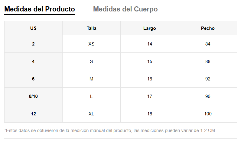 👉 Importante: la tabla corresponde a medidas de la prenda, no del cuerpo.